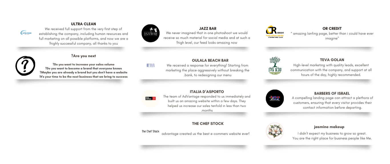 At AdVantage we focus on website building and business marketing in order to increase awareness of your business and turn it into a brand and increase your sales. We will be happy to help you improve your online presence and make your business a more recognizable brand.